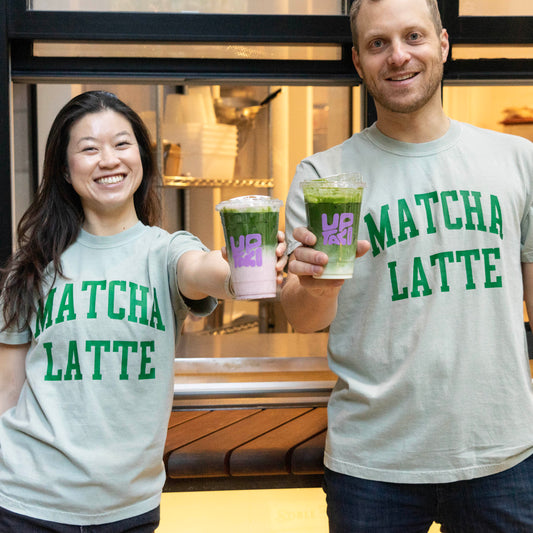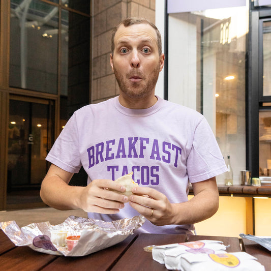 Breakfast Tacos and Matcha Latte tees, made in collaboration with Uptaco