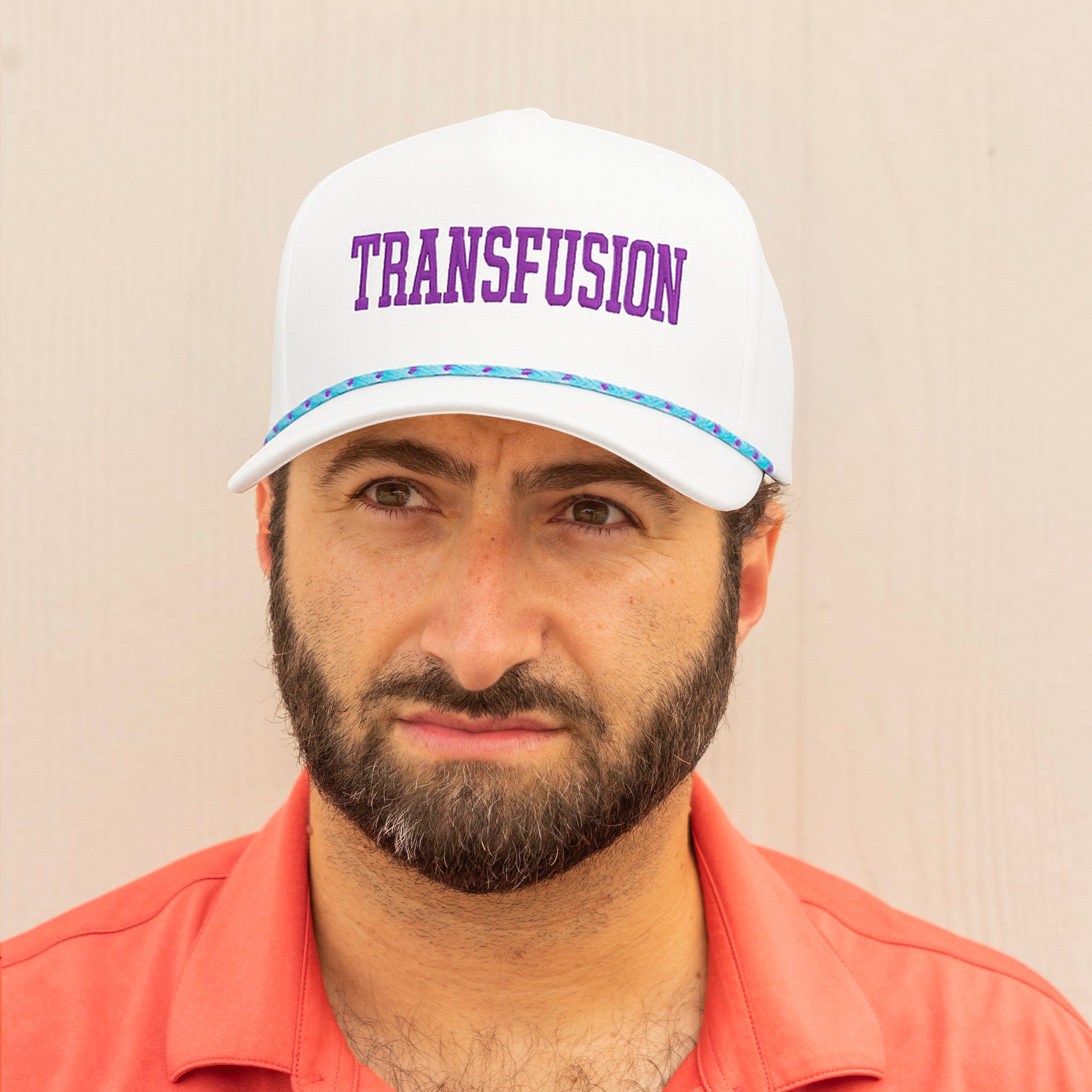 *PLEASE NOTE: The correct color for this hat is a white base with a teal & purple rope (first image). Other photography images might reflect a prior iteration of our Transfusion Golf Hat in a different color